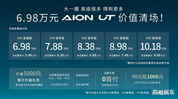 前两天全网都在猜埃安UT最终的上市价格,预售时8万的价位已经很能打了,没想到2月28日上市居然是6.98万起!如果叠加国家置换补贴,更是只要5.48万就能入手。6.98万就能买到一款轴距2750mm,配备IBCM智能车控系统,搭载了对外放电功能的A级纯电,远超出了大家的预料。这已经不是简单的高性价比,而是越级的乱杀了。